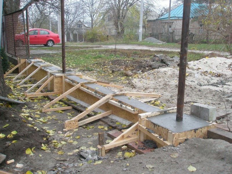 Заливка бетона: Вокруг столбов и по всей длине траншеи укладывается арматурный пояс, затем в готовую опалубку заливается цементно-песчаный раствор.
